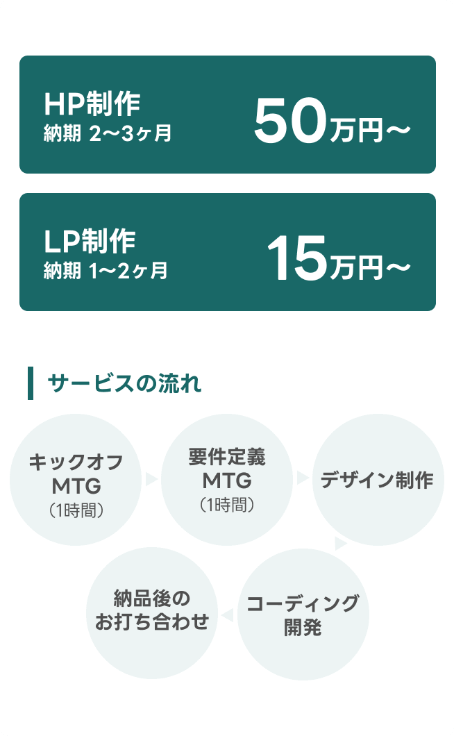 弊社はただサイトを制作するだけのではなく、制作目的からゴール設定、 さらに既存サイトの課題抽出から企画、設計、制作、運用までをワンス トップで対応します。