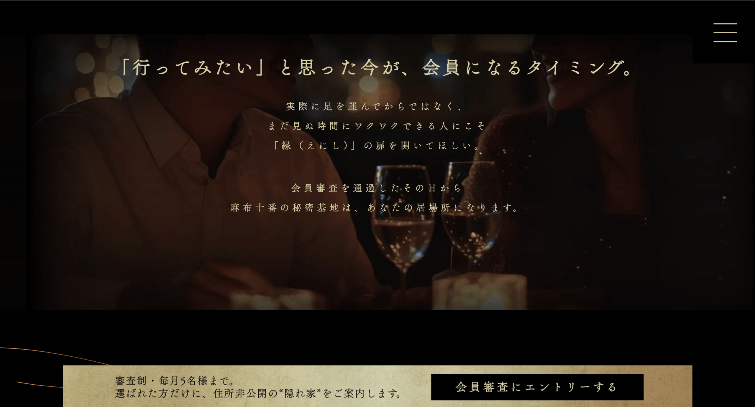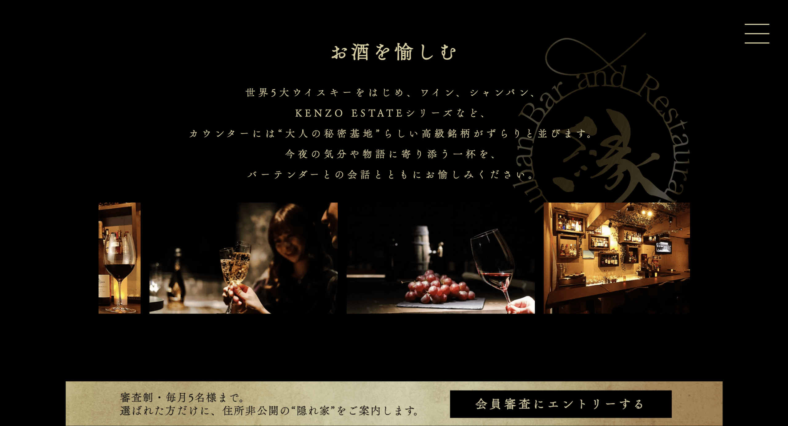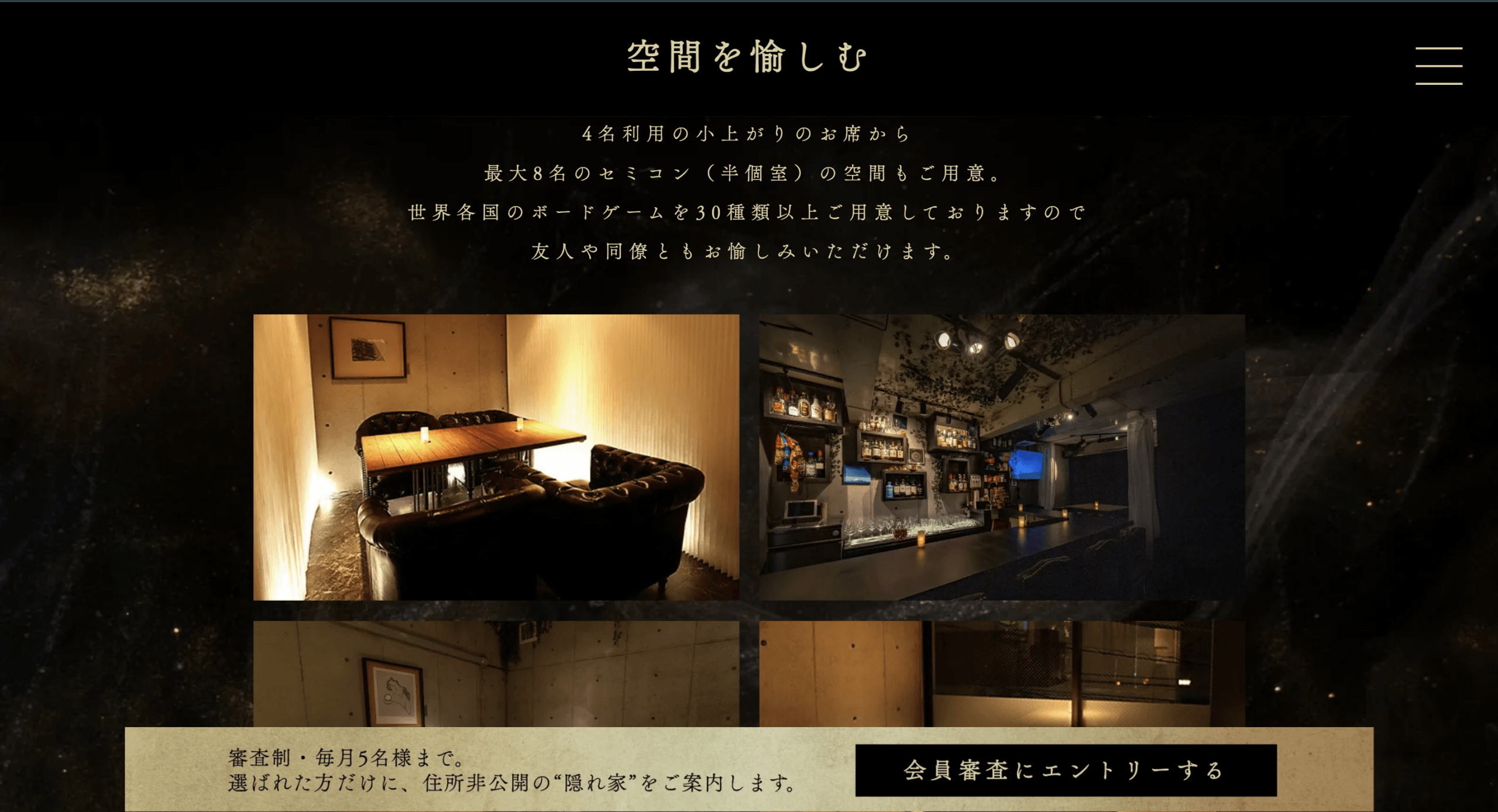 「どんな場所なんだろう」という好奇心を高めながら、会員登録というアクションへスムーズに誘導する導線を設計。敷居の高さを感じさせずに、それでいて「特別な人だけが辿り着ける場所」という世界観を損なわない、緊張感のあるUX設計を実現した事例です。